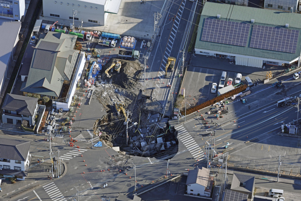 عکس گرفته شده از هلیکوپتر کیودو نیوز، گودال را در تقاطعی در یاشیو، استان سایتاما، در 31 ژانویه 2025 نشان می دهد. (Kyodo)
